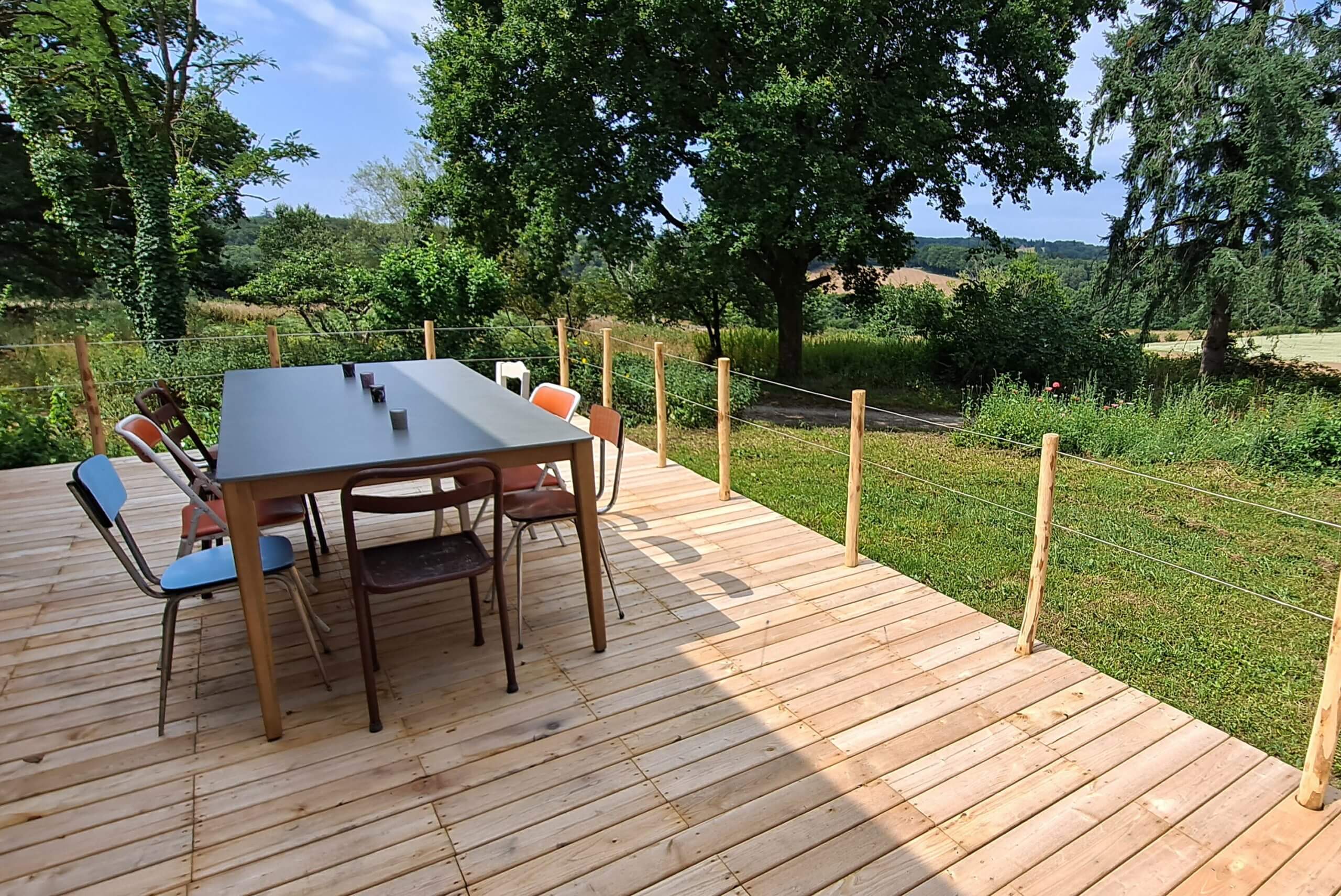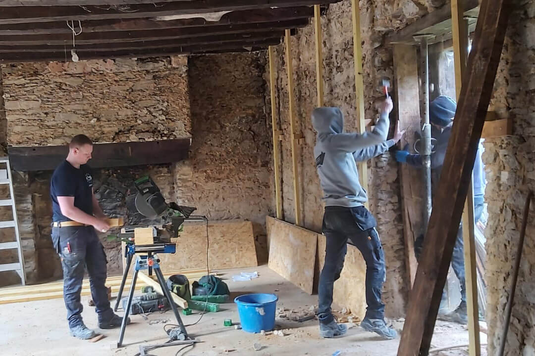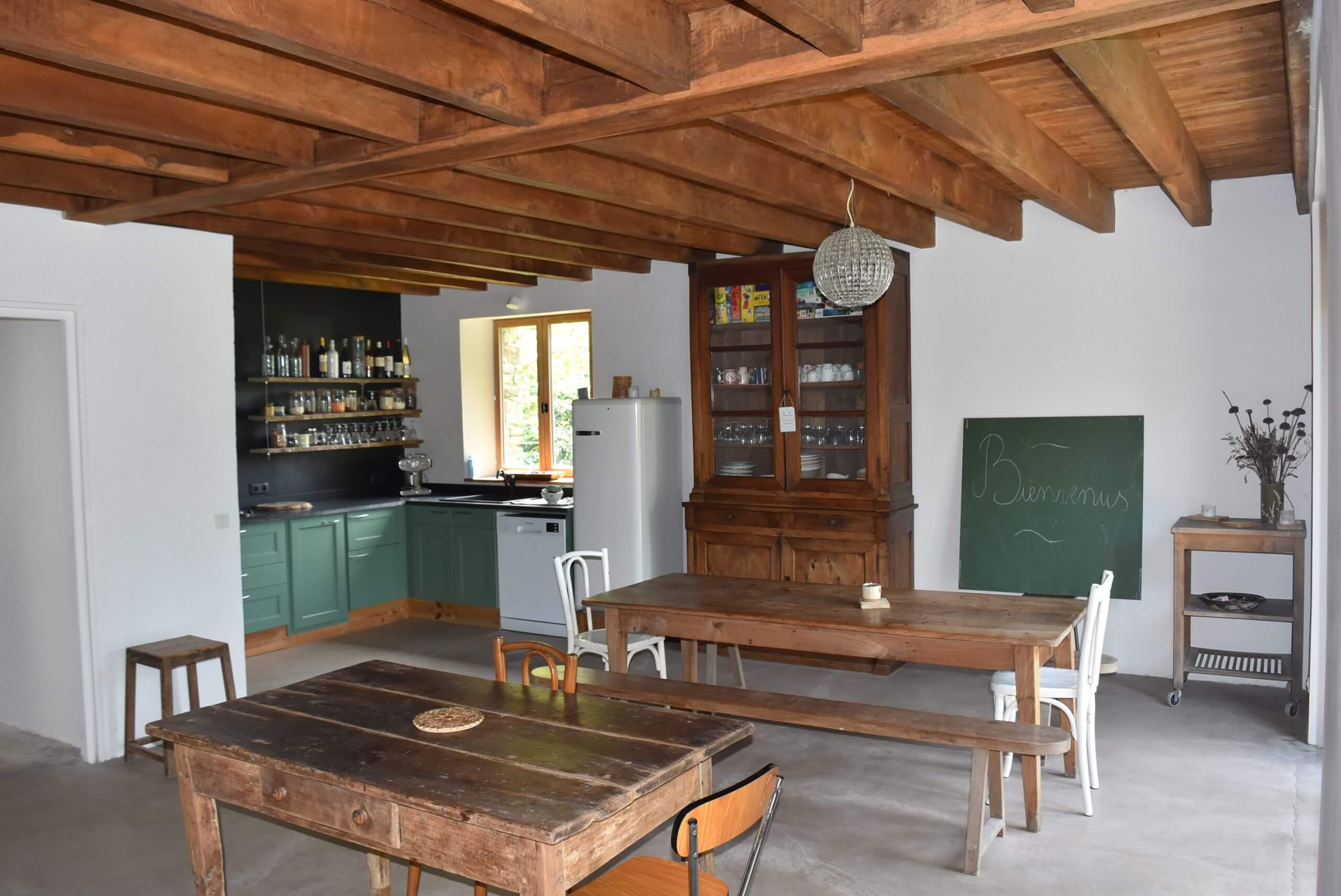 La ferme est un ancien hameau, composé de plusieurs bâtiments en pierre que nous rénovons au maximum avec des éco matériaux et aménageons avec du mobilier recyclé.